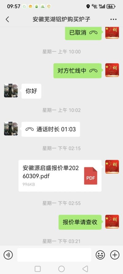 三月九号,报价发过去了。一套1.5吨固定式熔化炉,配圆铸锭线,带除尘系统——具体数字不说了,反正在他预算范围内。
